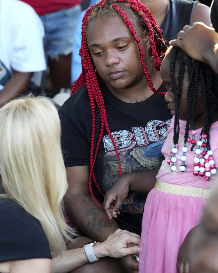 Jacksonville Mayor Donna Deegan, left, comforts Tyesha Jones, partner of Jerrald Gallion, who was killed in Saturday’s mass shooting, and his daughter Je Asia at a prayer vigil on Sunday in Jacksonville, Fla. John Raoux/Associated Press