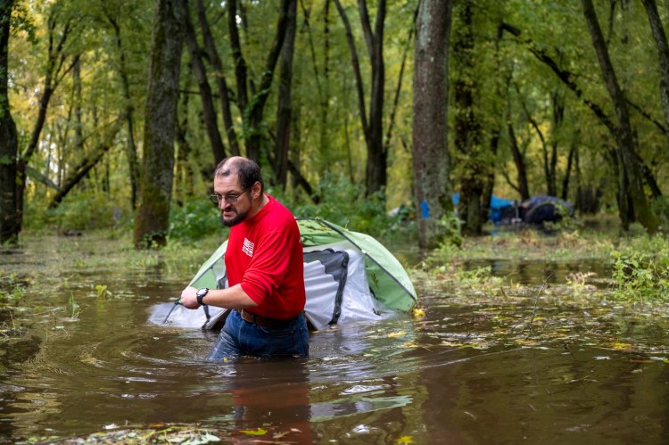Ryan Sirois wades through floodwater from the Kennebec River in Waterville last October as he pulls a tent containing his possessions to higher ground. Sirois, who is a military veteran, was living at the time at a homeless encampment near the Hathaway Creative Center in the city’s South End. Sirois volunteers full-time at the Waterville Area Soup Kitchen, where administrators say he is critical to its operation, but he suffered a setback recently when he sustained serious injuries in a fall from his bicycle. Morning Sentinel file
