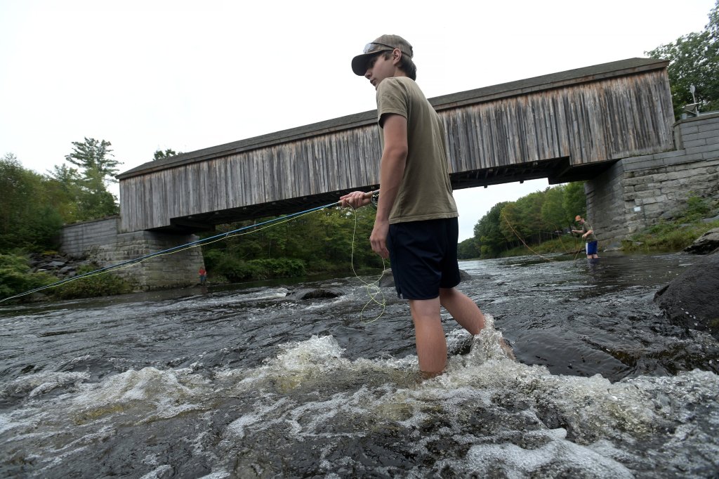 Nokomis Regional High School student Devin Treannie fly-fishes Monday on the Piscataquis River in Guilford. In the background is Low’s covered bridge. Rich Abrahamson/Morning Sentinel
