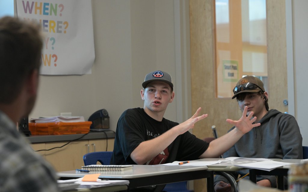 Nokomis Regional High School student Gerry Genereux, center, engages with teacher Nick Miller, left, Wednesday as students write in their journals about Monday’s fly fishing trip to the Piscataquis River. The class, which also includes Devin Treannie, right, is an interdisciplinary English course focused on fly fishing. Miller designed the curriculum for the class. Rich Abrahamson/Morning Sentinel