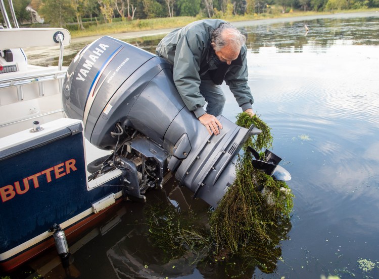 Joe Standart pulls hydrilla from his boat propeller after a short trip around Selden Cove in Lyme, Connecticut, a cove that is part of the Connecticut River, on Sept. 26. Aaron Flaum/Hartford Courant/Tribune News Service