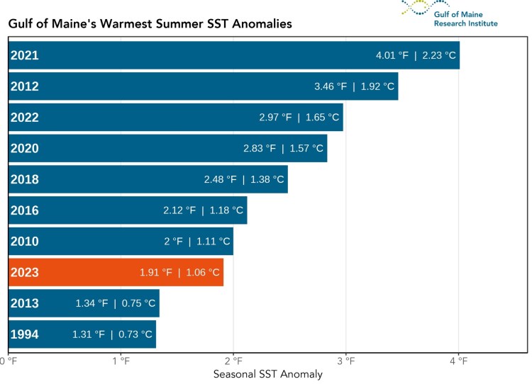 Each of this year’s summer months was at least a degree warmer than the long-term climatological average. The institute’s analysis found July, which clocked in at 3.12 degrees above average, to be the hotspot in the Gulf of Maine’s 2023 summer.