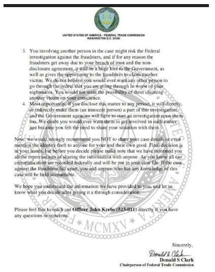 She was told to call “Det. John Krebs” of the Federal Trade Commission, who claimed criminals involved in drug and human trafficking had used her personal information to set up shell companies and the FTC was investigating whether she was involved. He texted her official-looking documents with the FTC seal and told her to not disclose the information to anyone because the agency viewed her as a possible cooperating witness.