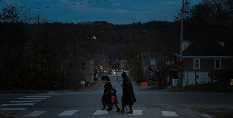 A costume-clad group walks the deserted streets of Hallowell at dusk on Halloween in 2022. Because of an issue getting insurance, this year’s parade has been canceled. Andy Molloy/Kennebec Journal file