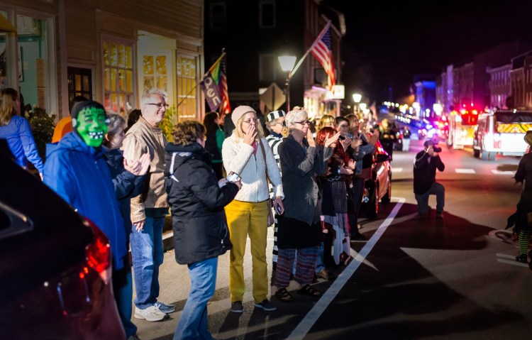 Onlookers observe the Halloween parade in Hallowell in 2019. This year’s parade has been canceled due to an insurance issue. Courtesy of Axell Photography