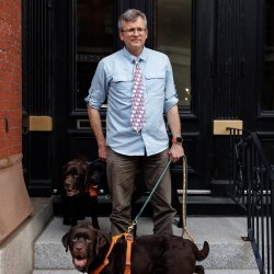 Portland attorney, Rob Ruffner, with his dogs, Gideon, front, Flynne and Luke, outside of his Portland office last month. Ruffner, who is the director of Maine Indigent Defense Center, has filed a petition alongside co-counsel Rory McNamara, asking the Maine Supreme Judicial Court to release a woman, who has been in jail for 80 days, because she hasn’t been appointed legal counsel. Brianna Soukup/Staff Photographer
