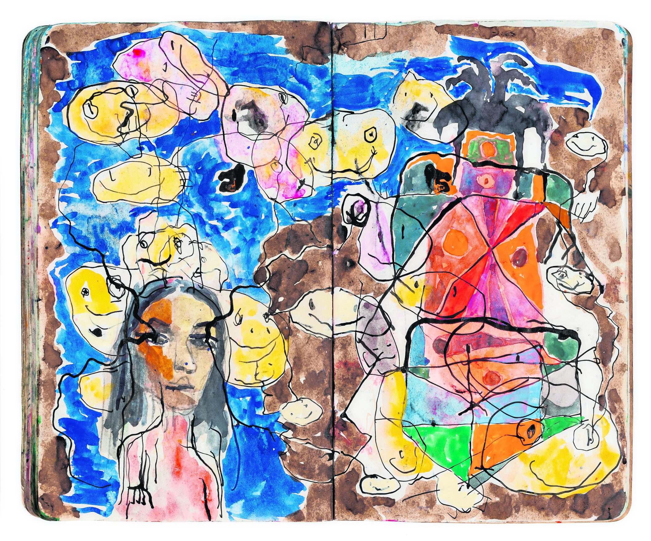 The Nomadic Studio sketchbooks are a pictorial travelogue of sorts, and also a journey through the artist’s imagination and oeuvre. “These are full of notations, human and geographic observations, and the never-ending development of visual and textual ideas that connect myths, marks, figures, fantastic creatures, Indigenous iconography, skulls, underground comix, cultural mashups, travel observations, and his take on the American landscape,” states curator Dan Mills. “Strongly related to his larger works, each spread stands alone–a work complete unto itself–as well as a yondering chapter in Kahlhamer’s inner and outer worlds.”