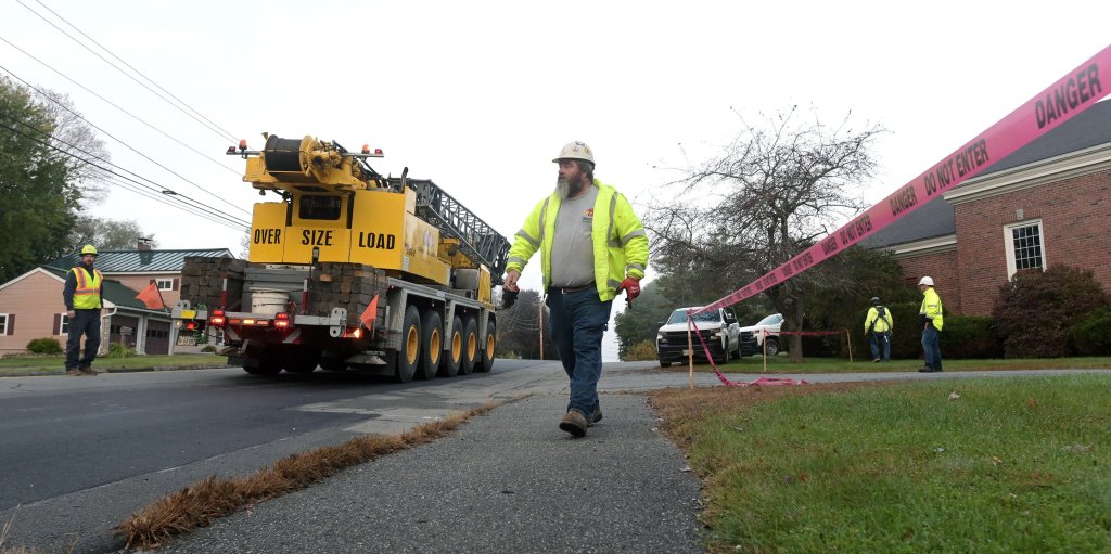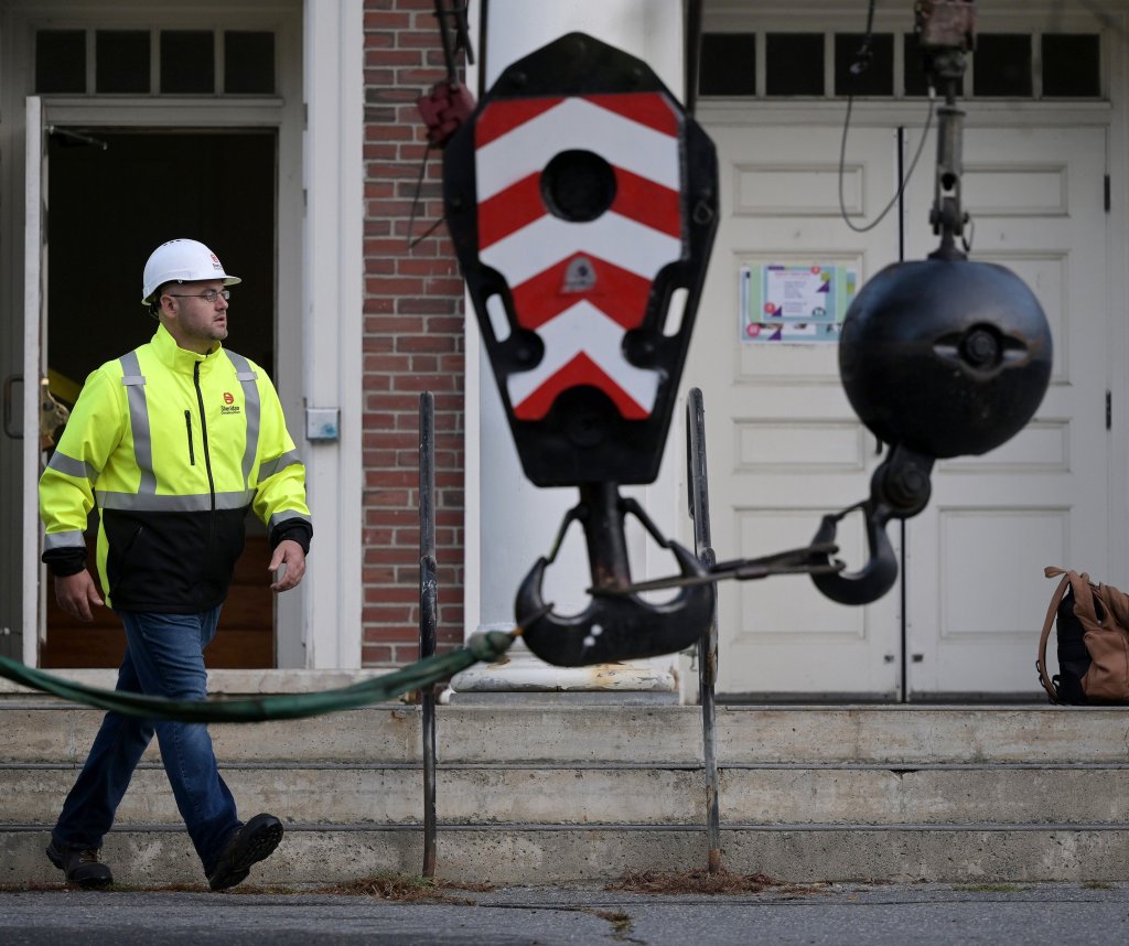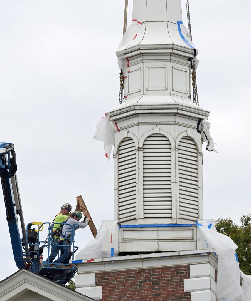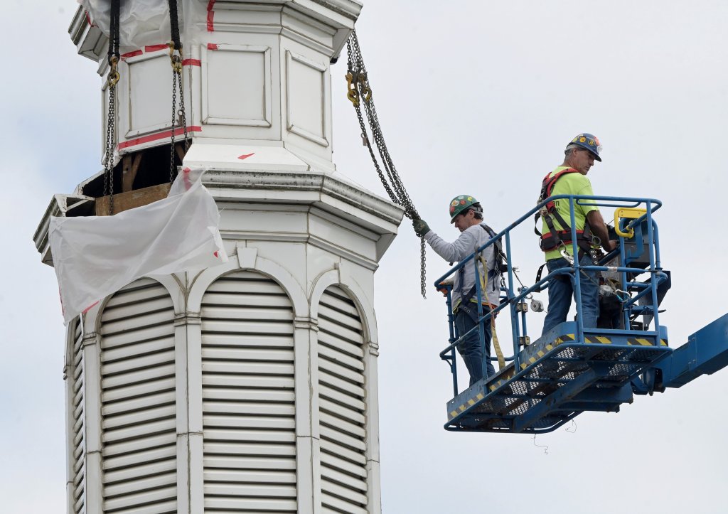 WATERVILLE — Workers from Sheridan Construction Corp. of Fairfield removed the steeple Wednesday atop the Children’s Discovery Museum of Central Maine in Waterville.