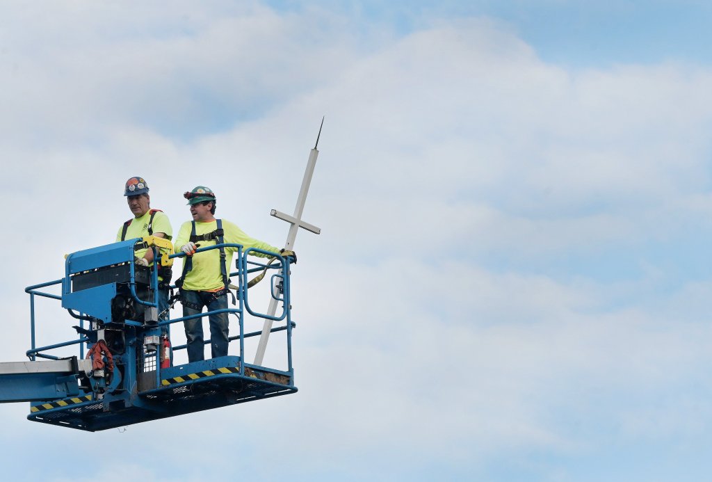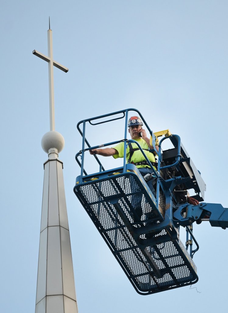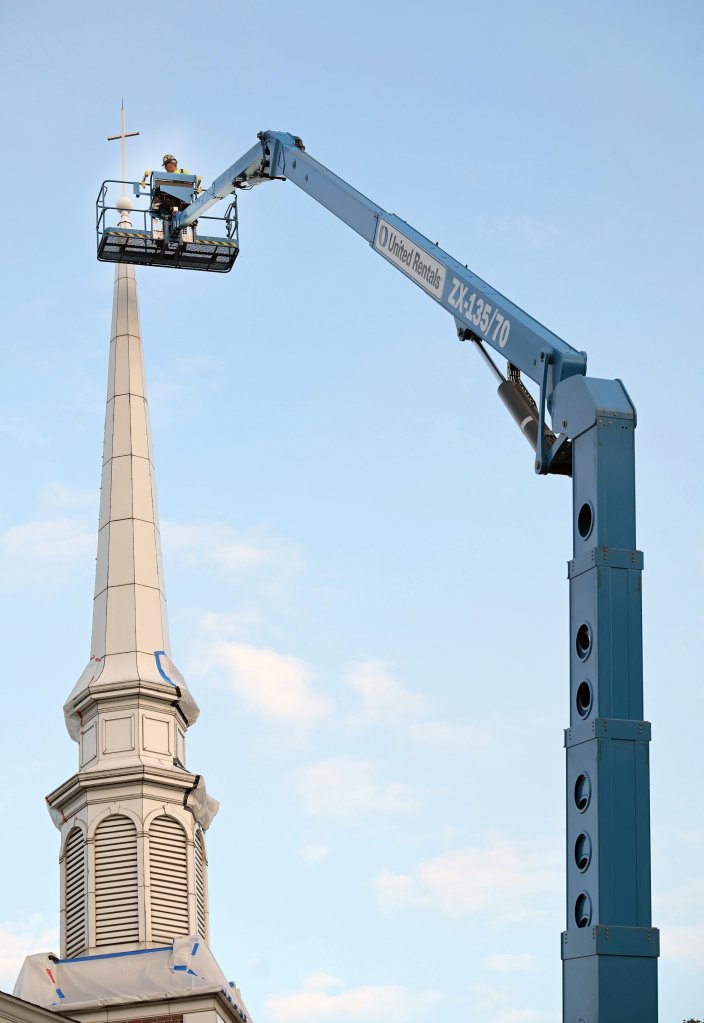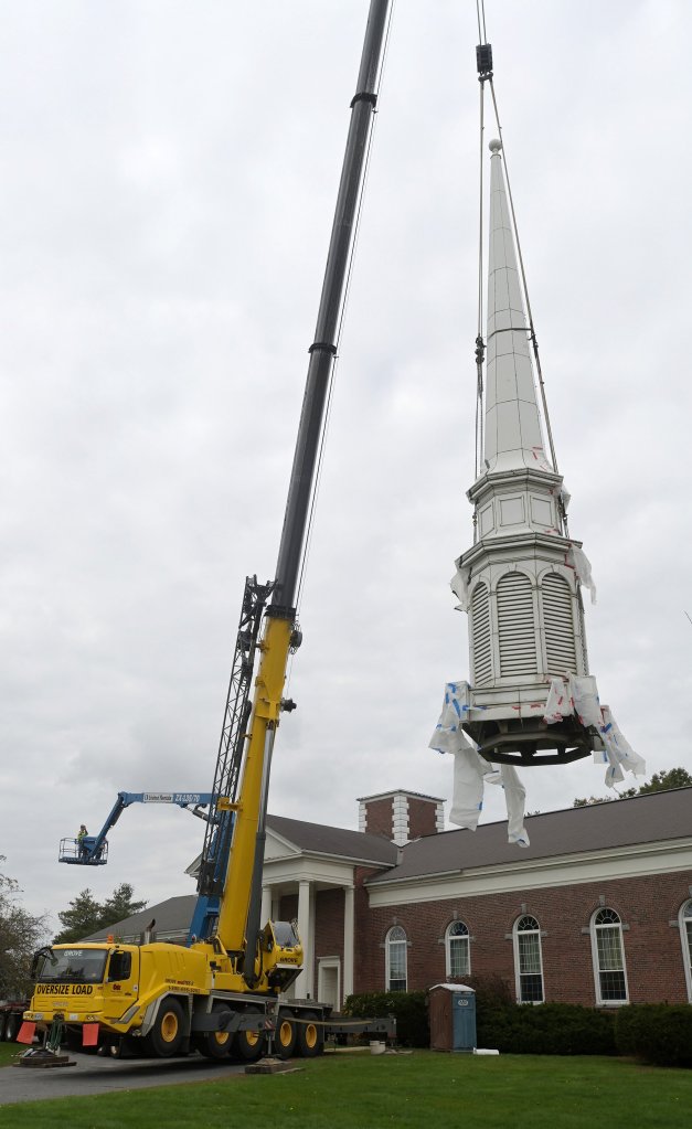 The work to remove the steeple was slowed by a hydraulic problem with the crane that was brought in to lift the steeple from the building. The problem was resolved and the removal was completed later Wednesday.