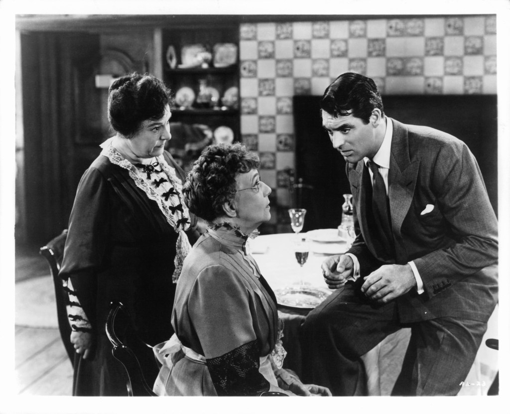 Jean Adair, left, and Josephine Hull talking to Cary Grant in a scene from the film “Arsenic And Old Lace,” 1944. Getty Images