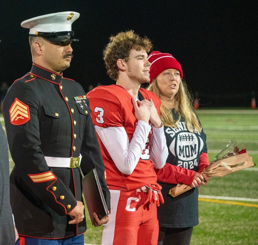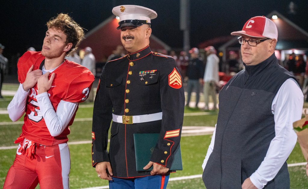 Marine Sgt. Joseph TuÕi, left, waits with Cony senior Parker Sergent and his mother Vikki Sergent for announcement of Scholar Athlete Award on Friday October 20, 2023 on ConyÕs Fuller Field in Augusta. A football player on each team won a scholarship from the Marine Corps. Joe Phelan/Kennebec Journal
