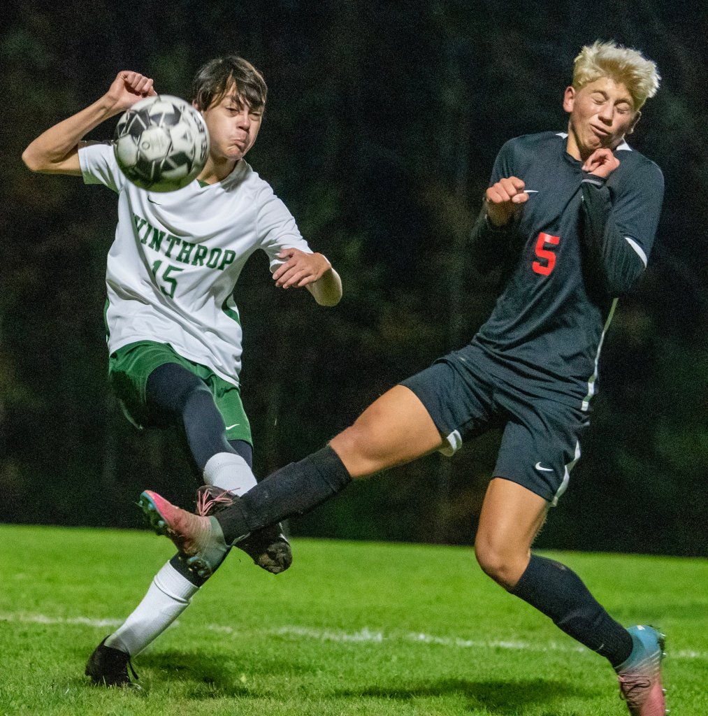 Winthrop’s Max Cheng, left, and Hall-Dale’s Keegan Cary compete for possession during a Class C South boys soccer quarterfinal game Wednesday in Farmingdale. Joe Phelan/Kennebec Journal