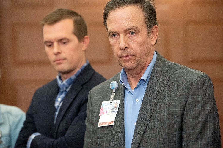 Central Maine Healthcare President Steven Littleson, right, and U.S. Rep. Jared Golden attend Thursday evening’s press conference at Lewiston City Hall. Daryn Slover/Sun Journal
