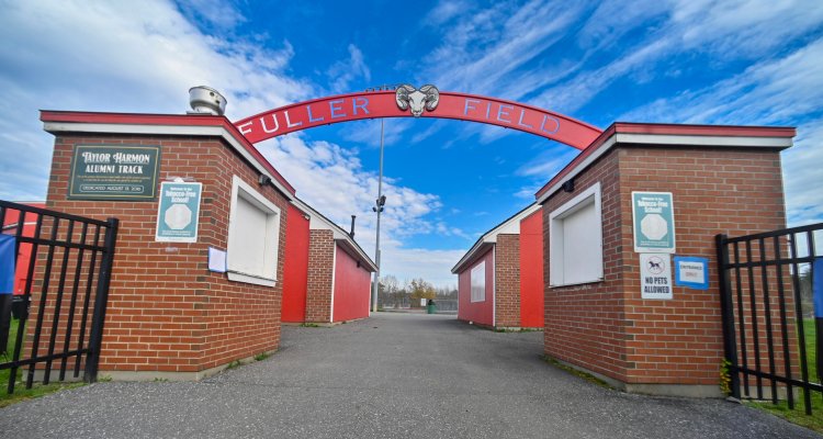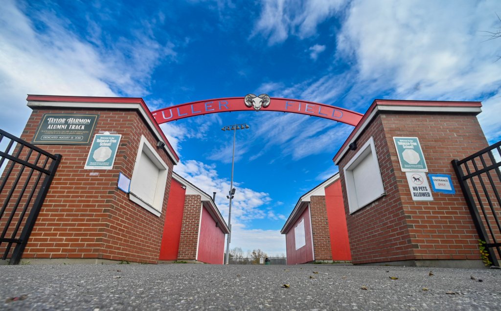 This Friday photo shows arched gates of Cony Middle/High School’s Fuller Field in Augusta. Cony teams were set to play host a Class B North football quarterfinal against Mt. Blue and a Class A North field hockey semifinal against Nokomis on Saturday but both playoff games have been postponed because of the Lewiston shootings. Joe Phelan/Kennebec Journal