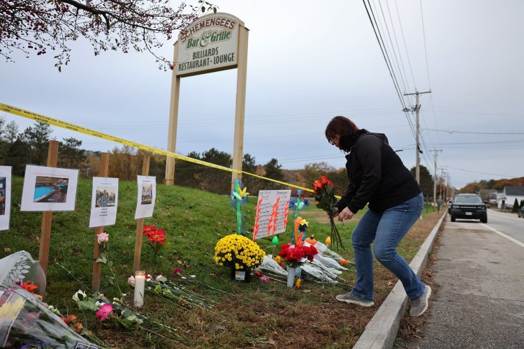 Diane Bowie, of Poland, lays a bouquet of roses at a memorial outside Schemengees Bar & Grille on Sunday. Bowie, who grew up in Lewiston, said she knew two people who were killed in the mass shootings: Tricia Asselin and Joe Walker. “Lewiston will never be the same,” she said. Ben McCanna/Staff Photographer
