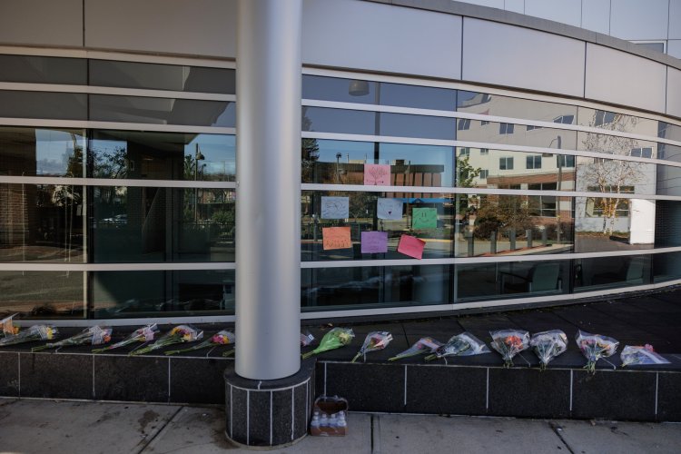 A small memorial with bouquets of flowers and small signs sits outside of the emergency department at Central Maine Medical Center on Saturday. Brianna Soukup/Staff Photographer