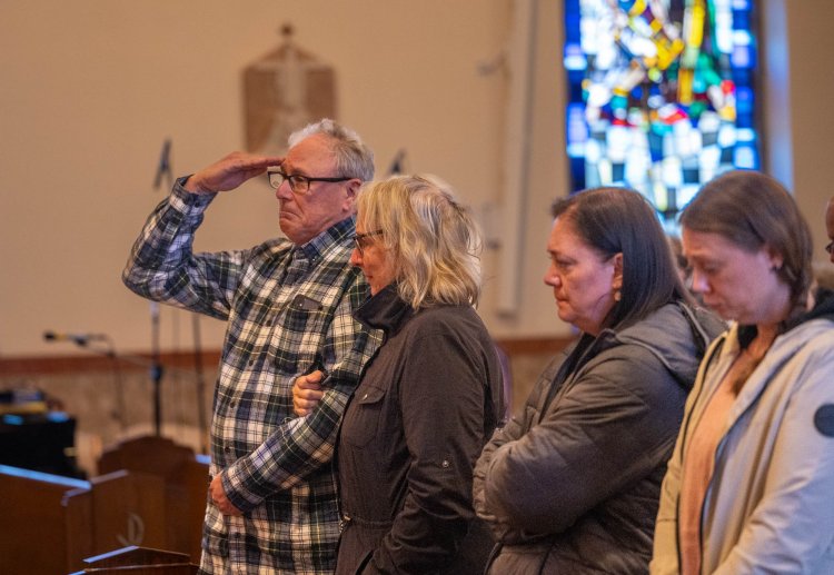Thomas Conrad’s father salutes his late son at a service at Holy Family Church in Lewiston for the victims of Wednesday’s shootings. Andree Kehn/Sun Journal
