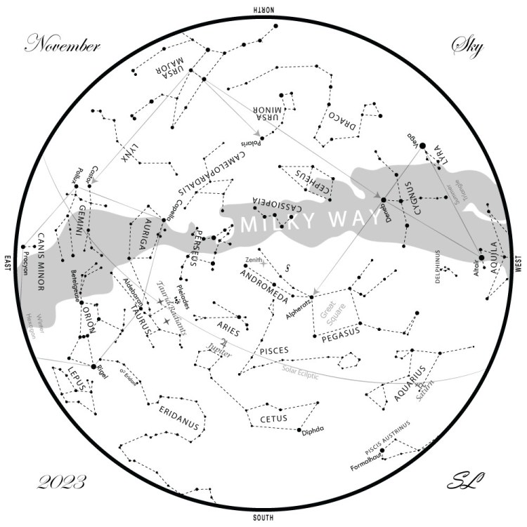 SKY GUIDE: This map represents the night sky as it appears over Maine during November, after Daylight Savings Time ends on November 5. The stars are shown as they appear at 10:30 p.m. early in the month, at 9:30 p.m. at midmonth, and at 8:30 p.m. at month’s end. Jupiter and Saturn are shown at their midmonth positions. To use the map, hold it vertically and turn it so that the direction you are facing is at the bottom. Sky Chart prepared by Seth Lockman