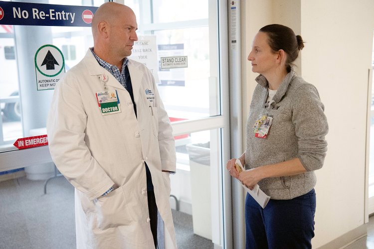 Chief Medical Officer John Alexander talks Monday with nurse leader Ann Howe at Central Maine Medical Center in Lewiston. They were working Wednesday when victims of two mass shootings were brought to the hospital. Daryn Slover/Sun Journal