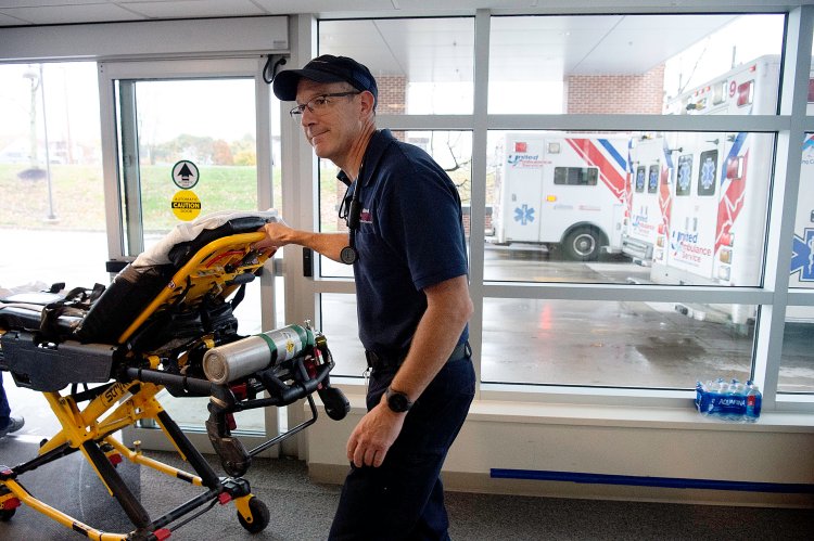 Nick Rathbone, a paramedic with United Ambulance Service, is shown Monday at Central Maine Medical Center in Lewiston. He was working Wednesday night when victims of two mass shootings were brought to the medical center on Main Street. Daryn Slover/Sun Journal