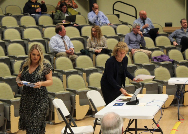 Amanda Clark, left, hands out information to the RSU 9 board of directors on Tuesday, Oct. 25, while CCHCS principal Carol Keisman gets her notes ready. Cape Cod Hill Community School’s first year as a community school was “very impressive” according to Maine Department of Education. Brian Ponce/Franklin County