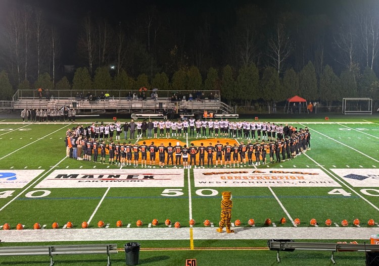 GARDINER — It’s rare for a football game under the lights not to be met with much fanfare. However, the first high school sporting event held in five days in central Maine saw a solemn beginning.
