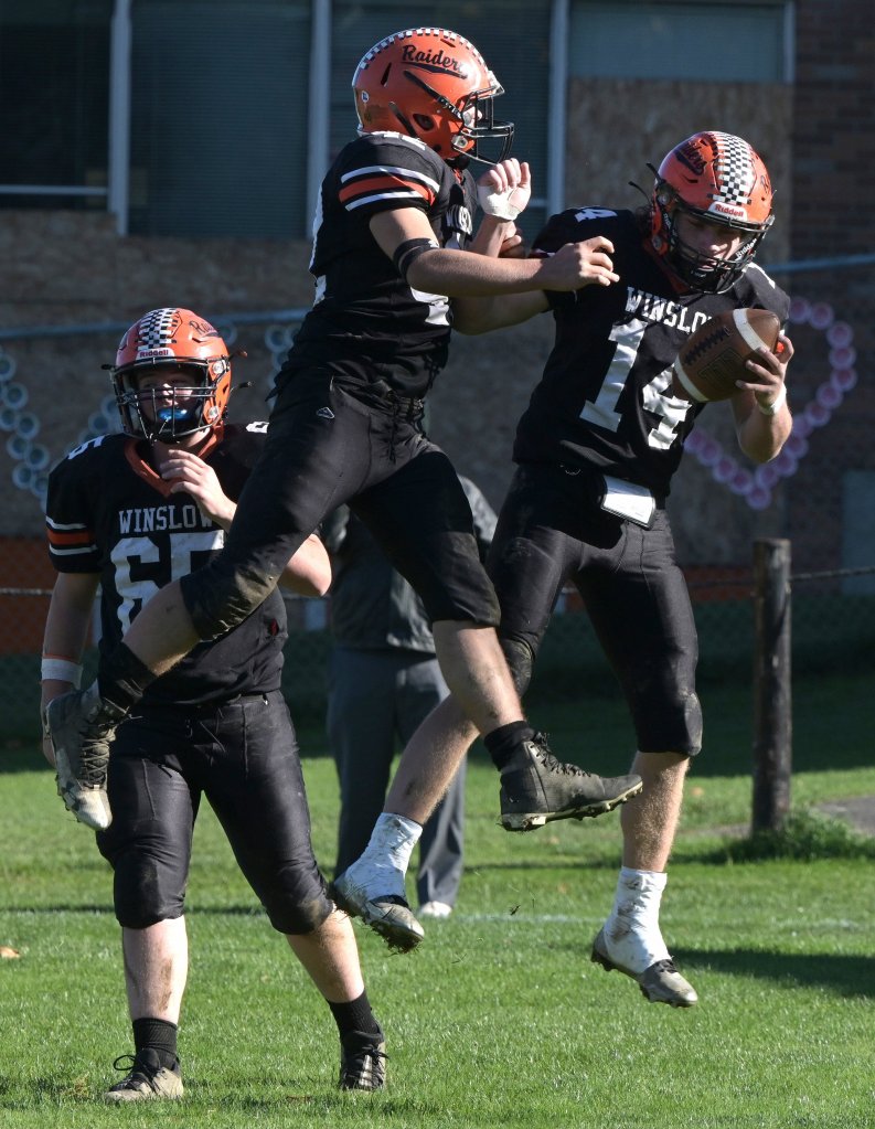 Winslow’s Liem Fortin, right, celebrates his touchdown with teammate Broddik Bimpson during a Class D North quarterfinal football game Monday in Winslow. Rich Abrahamson/Morning Sentinel