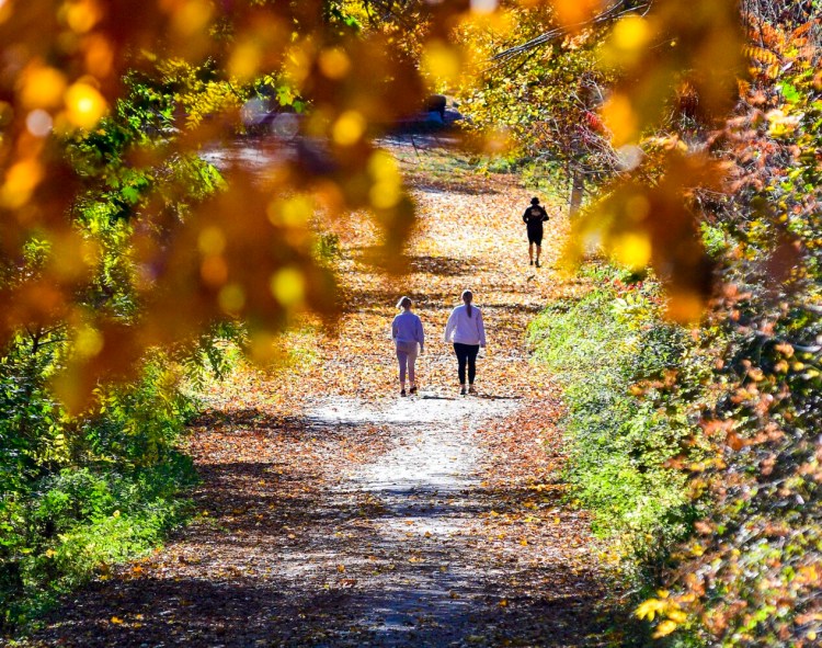 People walk and run along a section of the Kennebec River Rail Trail in Hallowell in October 2020. A section of the 6½- mile trail that lines the Kennebec River from Augusta to Gardiner will be closed Wednesday, blocking through traffic. Joe Phelan/Kennebec Journal file