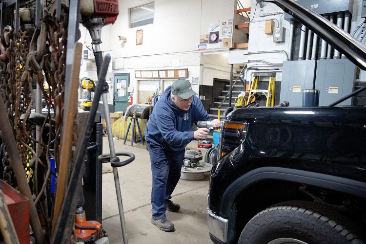 Phil Brienza, fleet operations superintendent for Lewiston Public Works, works on a truck Saturday at the shop on Adams Avenue. Daryn Slover/Sun Journal