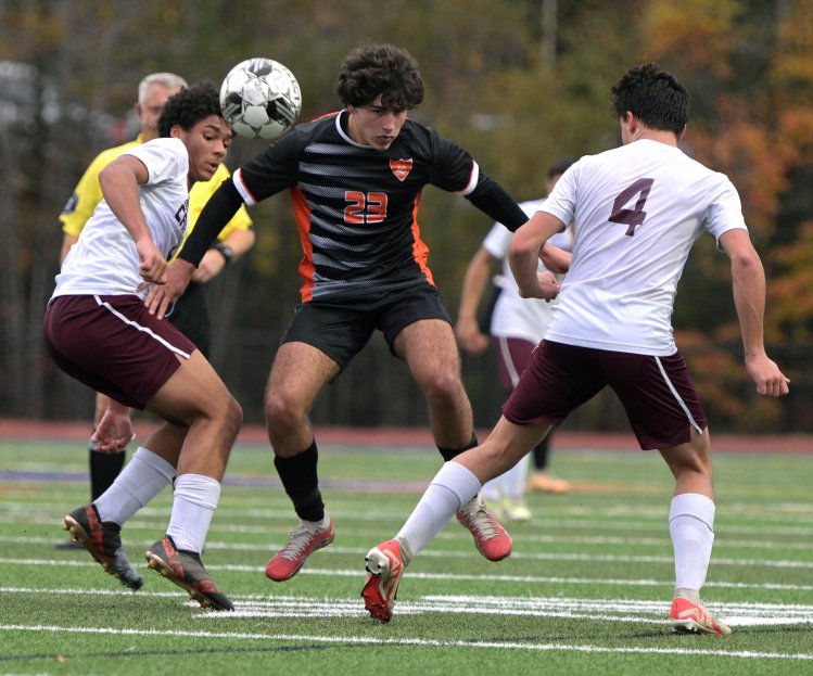 Winslow’s Braden Rodrigue center, takes on Caribou defenders Edison Sleeper, right, and Landon Albair during a Class B North quarterfinal game at Messalonskee High School in Oakland. Rich Abrahamson/Morning Sentinel