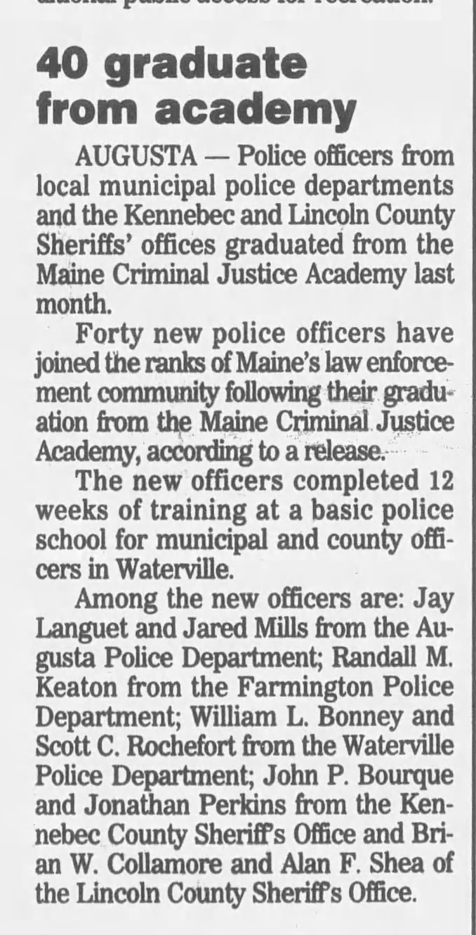 A news brief published Dec. 11, 1998, lists Augusta officer Jared Mills among the officers who recently graduated from the Maine Criminal Justice Academy.