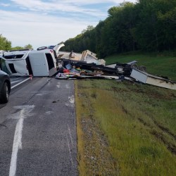 State police say a tractor-trailer struck a camper, causing it and the pickup hauling it to overturn.