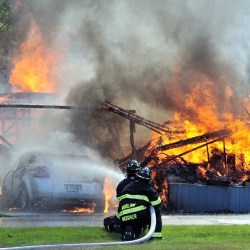 WINSLOW — Amid scorching hot temperatures, Priscilla Ouellette grabbed her small dog and a phone and ran outside Friday afternoon as a fire that started on her porch quickly consumed her mobile home.