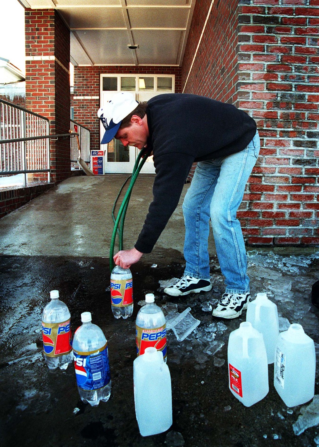 JAN. 12: Marc LeClair fills up bottles with water at the Ricker Middle School, Litchfield for use in his home which has been without power and water for days due to the ice storm.