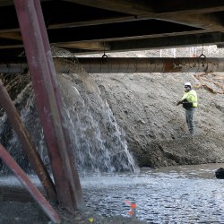 Witnesses said an excavator struck a water main under Bridge Street around 9:45 a.m. Thursday.