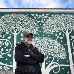 From the five moons of Pluto at Mayo Street Arts to a leaf-covered tree design replacing the Greyhound bus station mural, you don't have to walk far in the city to encounter Corrigan's work.