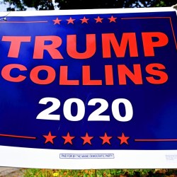 The party has posted signs reading 'Trump Collins 2020' in an effort to link the 2 Republicans in voters' minds. The Collins campaign calls it a ‘petty’ stunt.