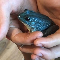 Konor Dyer, 14, of Strong, came across the blue-colored amphibian while searching for an entry in a frog jumping contest slated for Saturday.