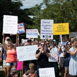 At least 300 people gathered near Maine Medical Center to call for personal choice in medical decisions.